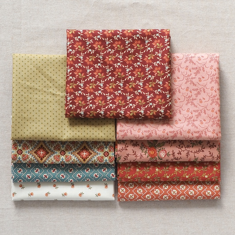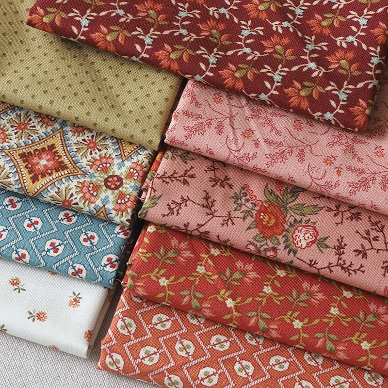 A beautiful palette of warm reds, pinks, golden bronze and teal in reproduction style fabric prints.