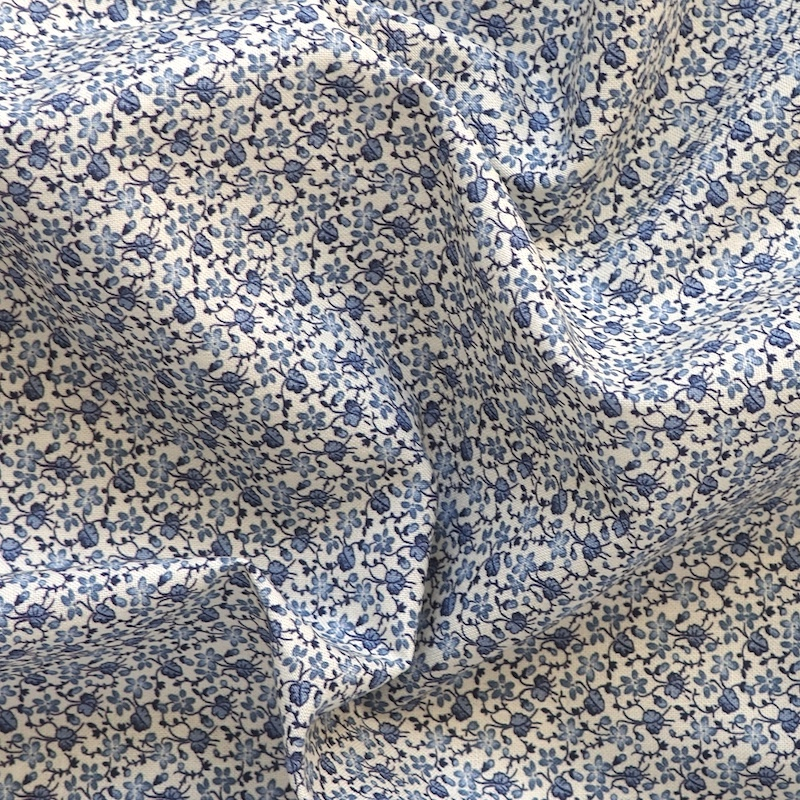 1800s reproduction floral featuring a delicate pattern of blue petite flowers set against a soft, neutral background.