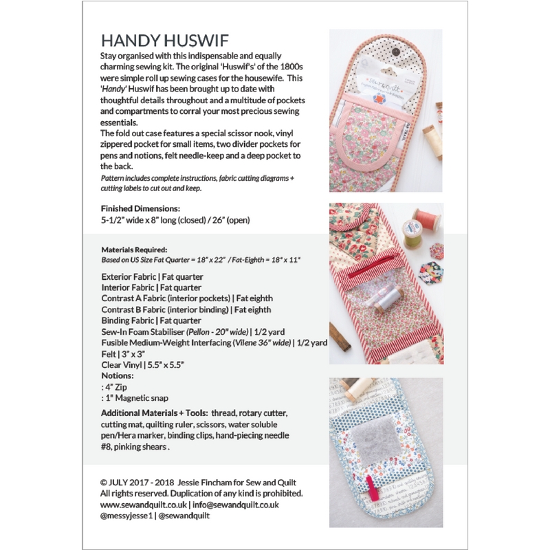 Stay organised with this indispensable and equally charming sewing kit. The original 'Huswif's' of the 1800s were simple roll up cases for the housewife. This 'Handy' Huwif has been brought up to date with thoughtful details throughout and a multitude of pockets and compartments to corral your most precious sewing essentials. Designed by Jessie Fincham.