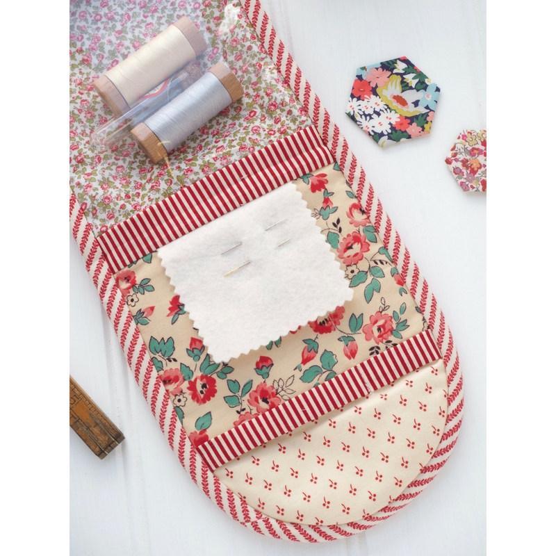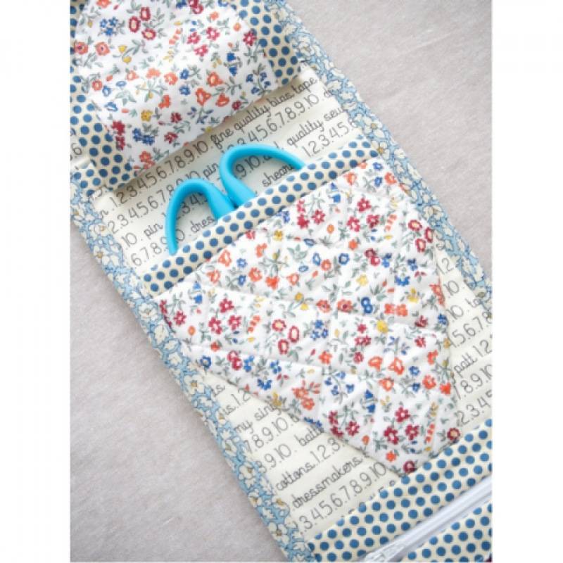 This delightful little travel-sized fold out case features a special scissor pocket, vinyl zippered for small items, two divider pockets for pens and notions, felt needle keep and a deep pocket to the back. The updated 6-page pattern includes complete step-by-step instructions and diagrams to follow as well as fabric cutting instructions, suggested cutting layout diagrams and handy cutting labels to cut out and pin to your fabric pieces for easy reference.