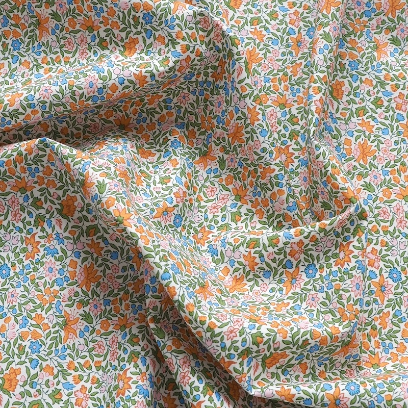 Clarissa was originally printed in 1965, inspired by old Indian chintz designs from the Liberty archive in an intricate trailing botanical brimming with an array of tiny decorative blooms. Shown here in a beautiful pink, orange and blue colourway on an off-white background.