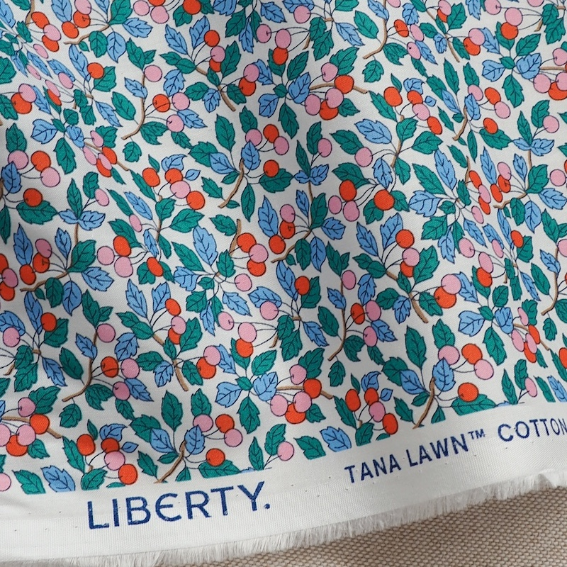 Hand-painted in 1960 by Colleen Farr, who established Liberty’s first in-house design studio in the early 1950s, Colleen’s Orchard captures the essence of summer with juicy cherries strewn across leafy branches. Shown here in bright colourway on an off-white background.