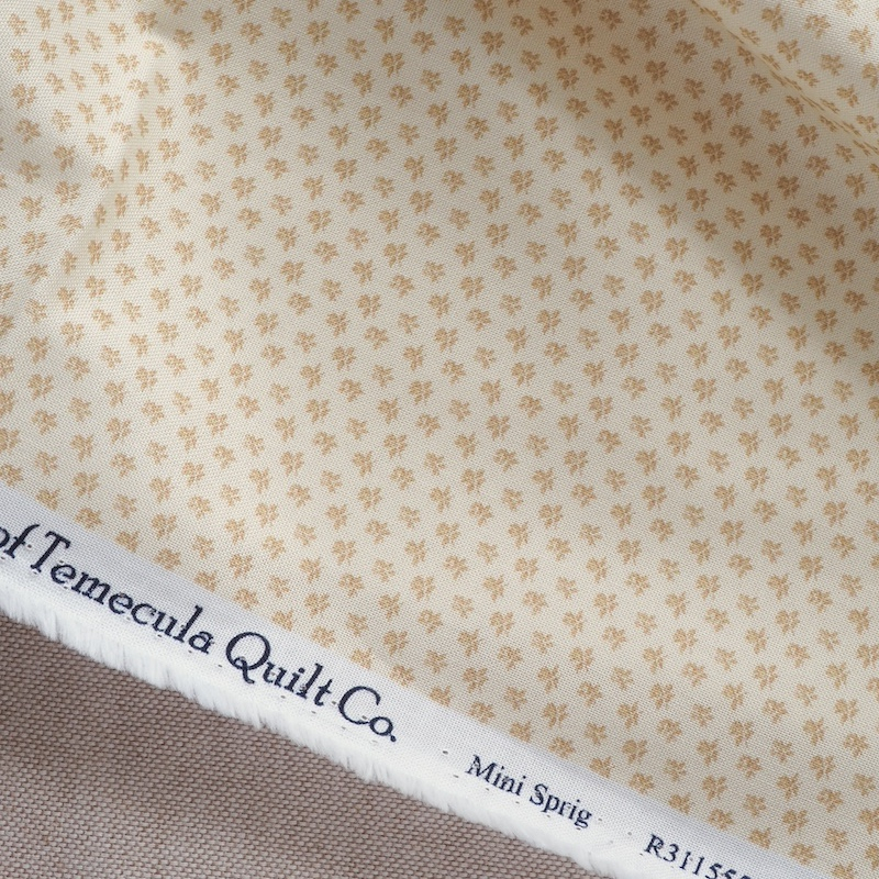 A delicate 1800s calico style print on a cream background adorned with a subtle, repeating pattern of mini sprigs in a slightly darker tan shade.