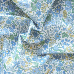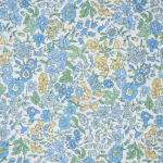 Emma Amelia embraces Liberty’s classic floral style. The earliest traces of this whimsical design were discovered as fabric fragments in various 1930s Liberty pattern books. Delicately illustrated foxgloves, primroses, daisies, and bluebells evoke a sense of familiarity and nostalgia. Shown here in a blue and yellow colourway on a white background.
