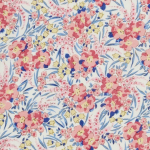 Liberty Fabrics’ Swirling Petals print is inspired by a gallery’s maze of grand rooms hung with shadowy, elegant Dutch flower paintings – their delicate blossoms pirouetting between gilded frames. Here shown with pink and blue flowers on a white background.