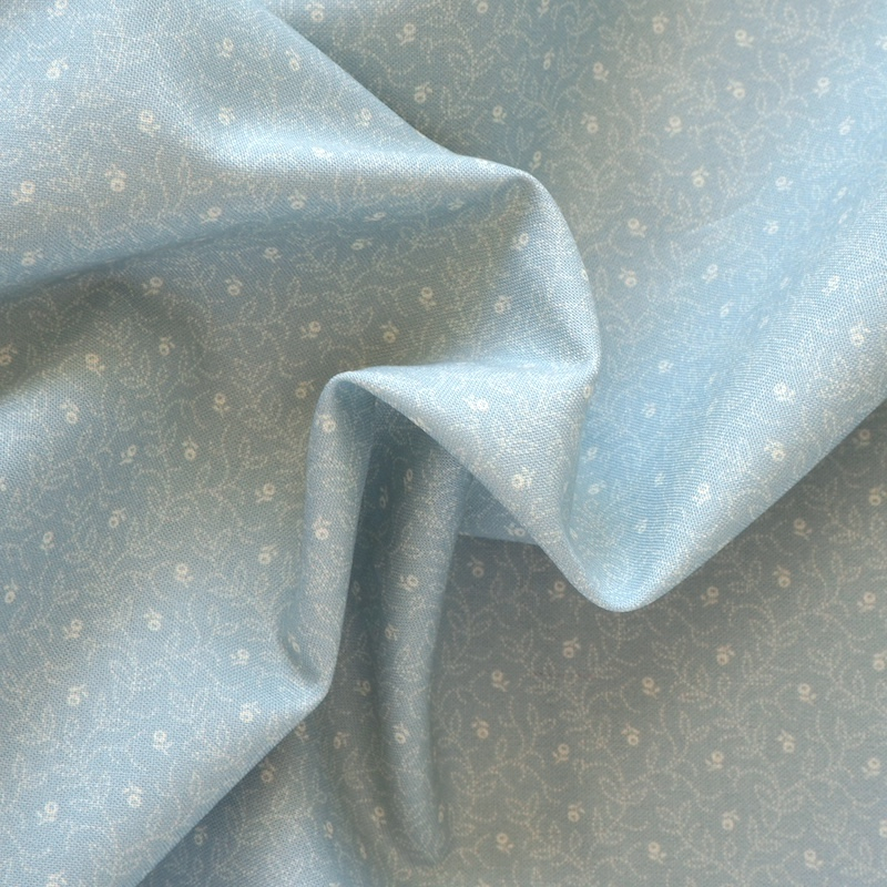 1800's reproduction floral featuring evenly spaced floral motifs in a light cream colour against a serene sky blue background.