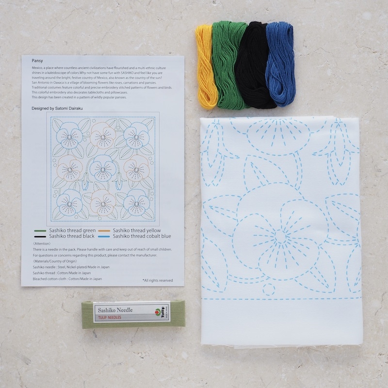 Kit includes; Tulip Sashiko needle, Sashiko thread, pre-printed natural cotton cloth and instruction sheet.